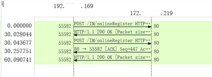上图中,1.169 的 IP 发送了一个 post 的请,但 230.219 在 30秒后再回复,然后下一个请求又很快,所以显然,这个服务在响应请求时卡了一个 30 秒,如此可以进一步确认,应用本身存在问题,需要进一步的排查。