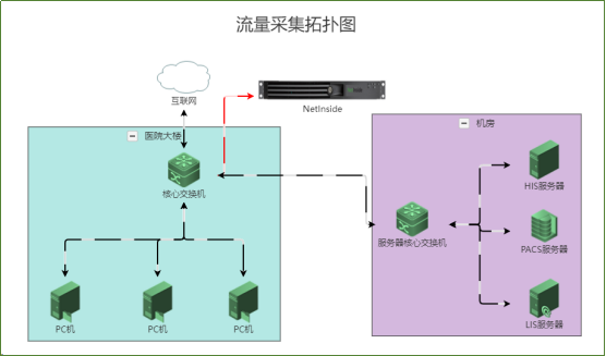 与技术人员沟通了解到,医院的整体流量不是很大,因此在医院大楼的核心交换机进行流量采集,系统采用旁路方式镜像流量,对全院的内部及外网流量进行监控。