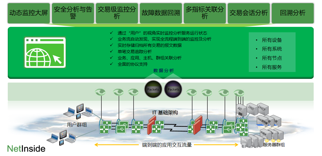 在数据中心数据中心数据中心、智算中心的运维场景中,跨层级故障定位、全流量回溯、低侵入部署是技术团队的核心诉求。传统基于Agent的监测方案因数据断层、侵入性强等问题难以满足需求,而基于流量旁路采集的网络应用性能监测系统,通过深度协议解析、全流量存储回溯等核心技术,构建了“采集-解析-存储-回溯”全链路可观测体系,成为技术落地的优选方案。