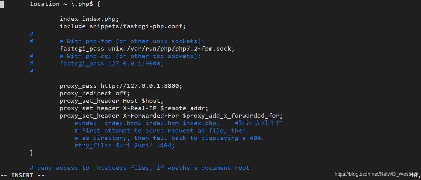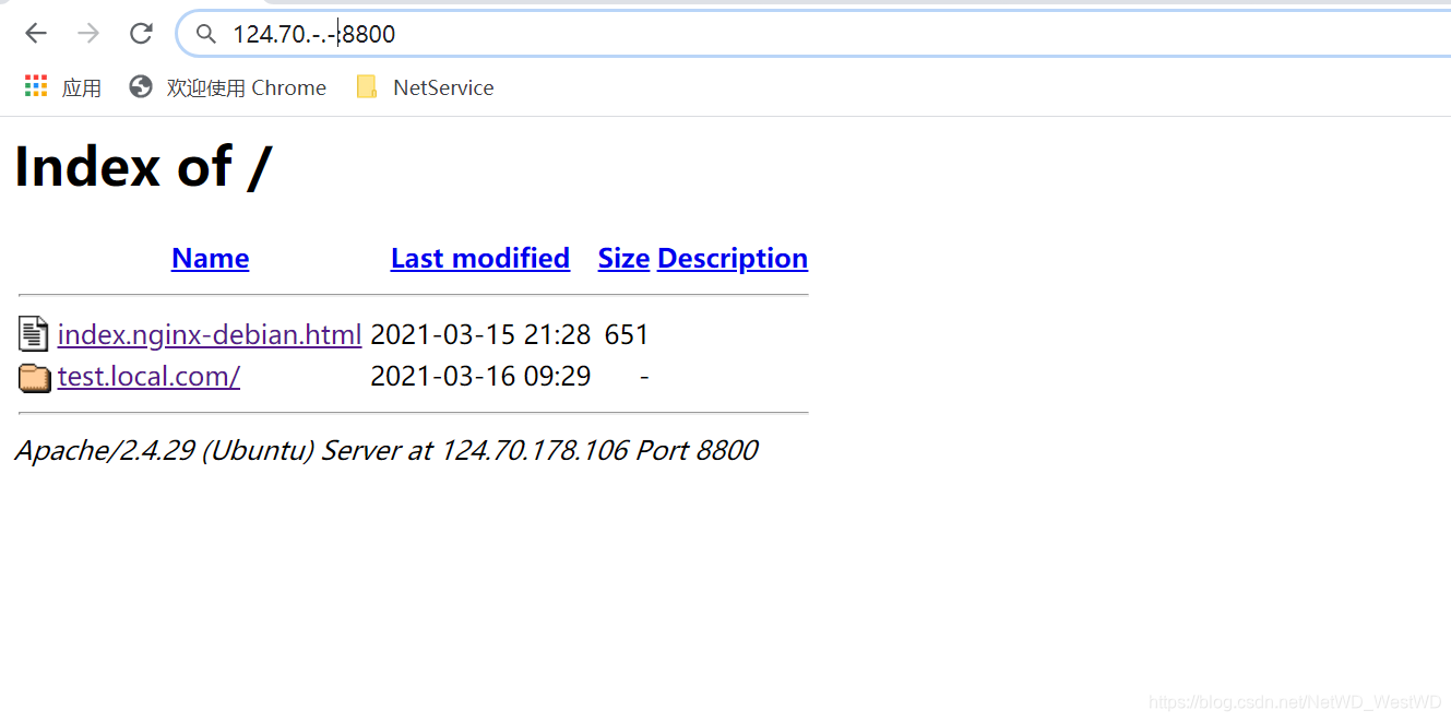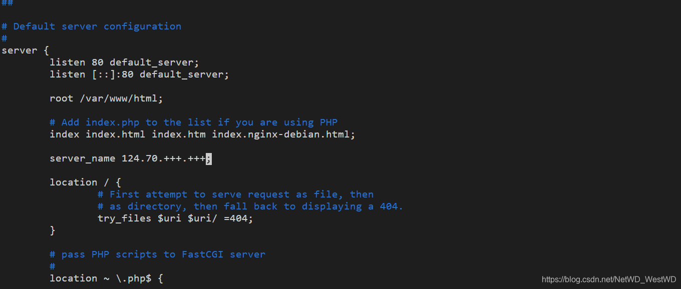 ---->nginx配置内容:Server_name就是自己的云服务IP, nginx监听80端口,PHP的动态网页转8800的apache2代理: