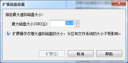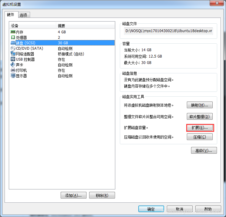 1.将虚拟机处于关机状态,扩大虚拟机的容量。硬盘->扩展