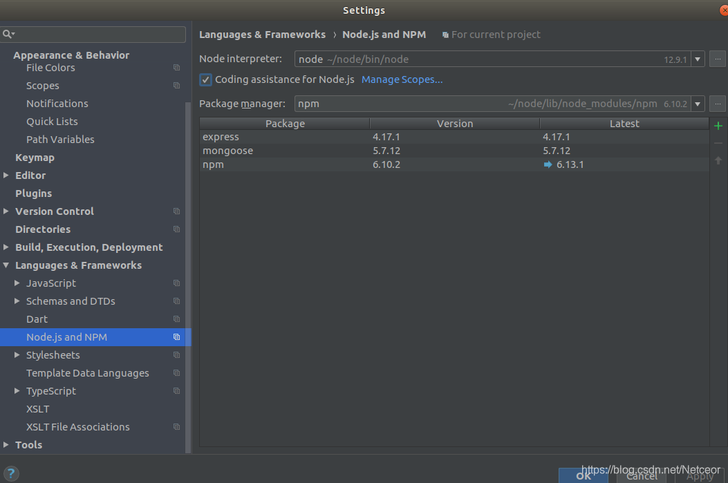 这里要打开File→ Settings→ Languages & Frameworks→ Node.js and NPM,打开Coding assistance for Node.js