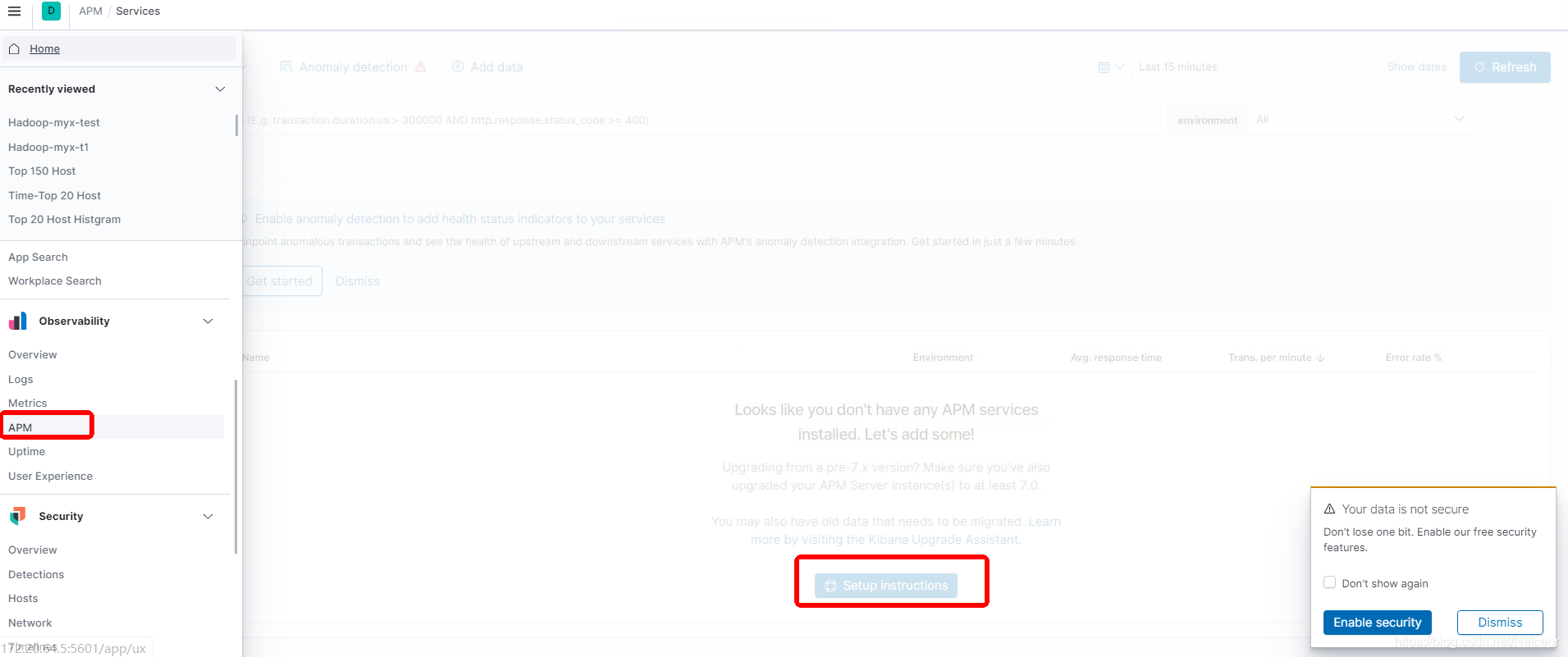 开启Kibana,打开APM界面并setup instructions