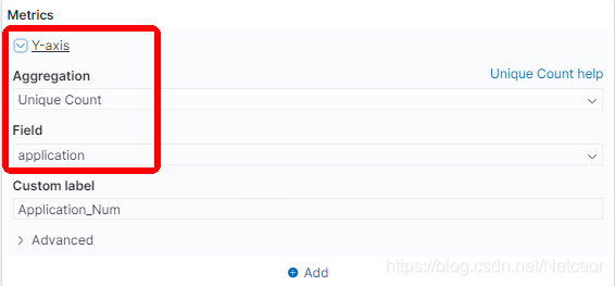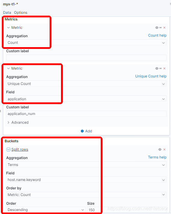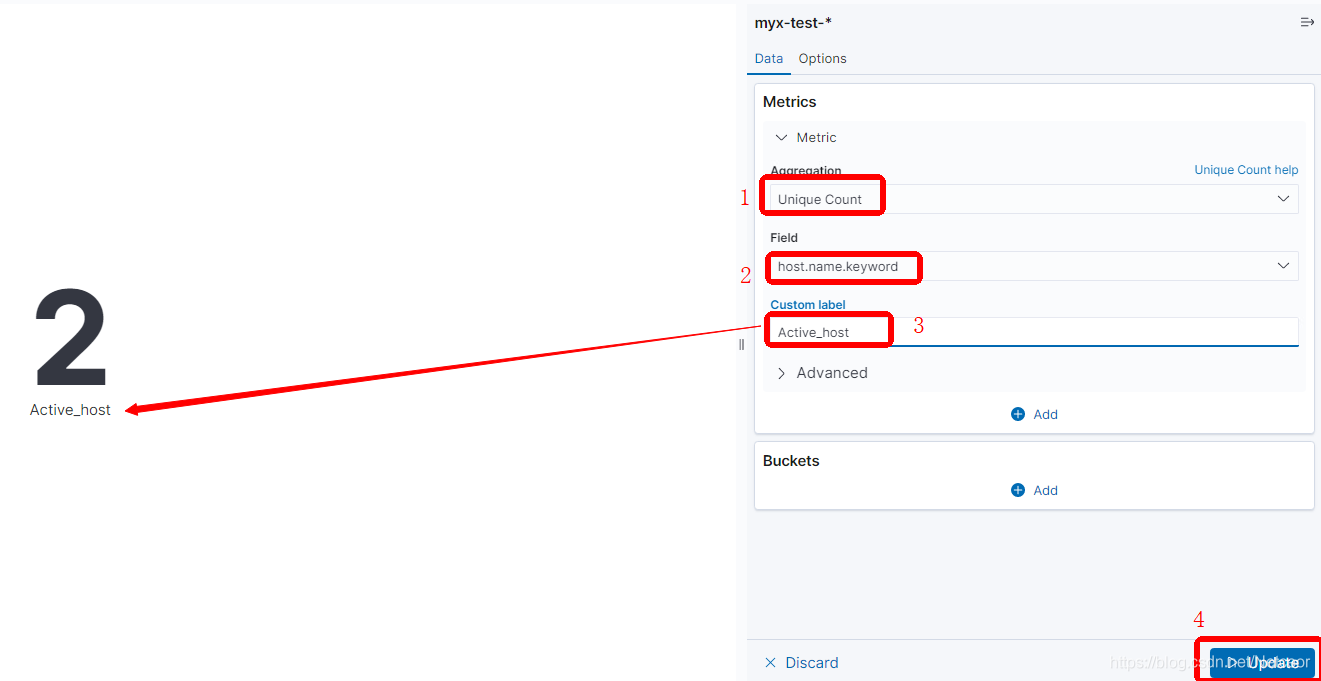 为了显示某时间段内运行的host,将聚合方式选为去重计数,将可以唯一标志host的host.name.keyword作为区域,Label为自定义字段,可不填写。