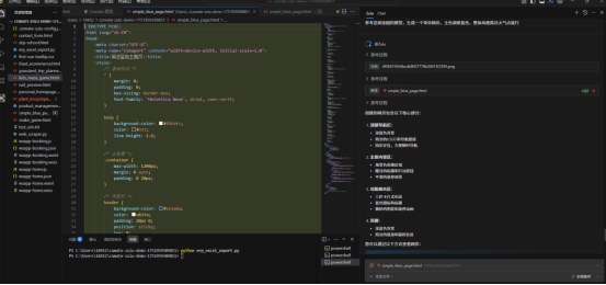 抱着死马当活马医的心态,我打开了文心快码。一股脑把那两张“灵魂设计稿”传了上去。然后在输入框里,尽量用大白话描述:“参考这两张图的感觉,生成一个单页网页,主色调要蓝色,整体风格简洁大气点就行。”