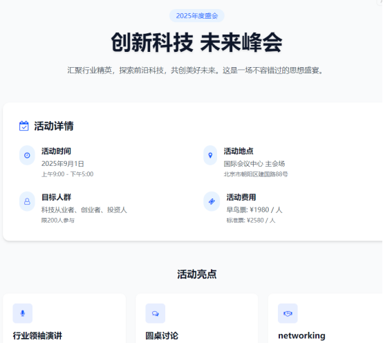 结果真有点出乎意料,大概也就十分钟左右吧,它真的给我“吐”出来一份完整的HTML和CSS代码!我赶紧在浏览器里打开预览,嘿,框架搭得有模有样!大标题的字体大小会自己适应屏幕,时间和地点清清楚楚分两行排着,几个亮点用列表展示出来,间距看着挺舒服,报名按钮是蓝底白字,鼠标放上去还会变亮一点,正是我想要的那种清爽感觉。