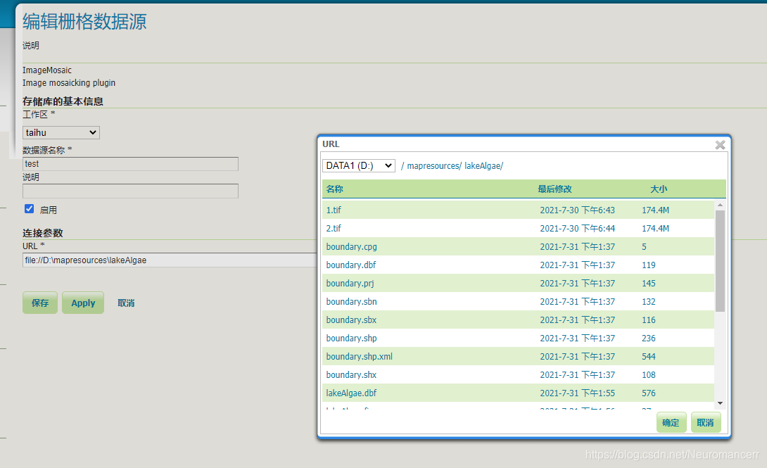 工作区和名称看着填写,url点击浏览,选择上一步包含了影像和shp的文件夹,确定->保存