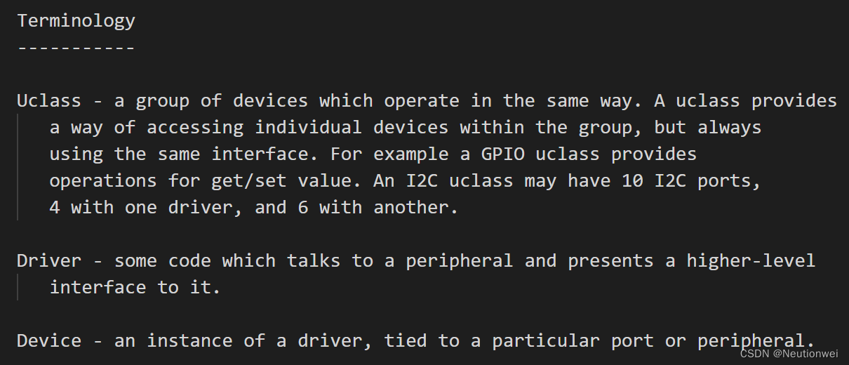在U-Boot驱动模型中,主要包含三个对象,分别是Uclass、Driver与Device,具体介绍如下: