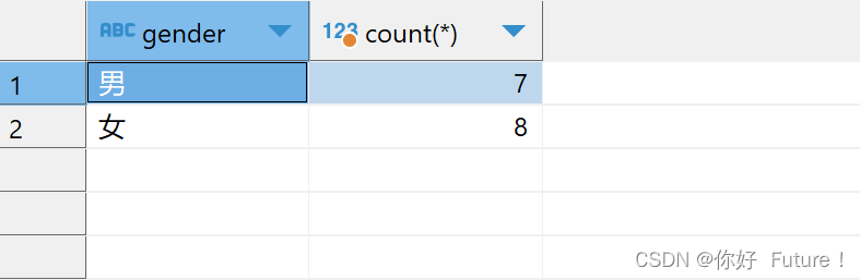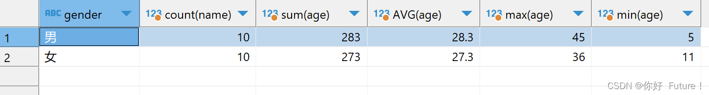 select gender, count(name), sum(age), AVG(age), max(age), min(age) from student group by gender;
