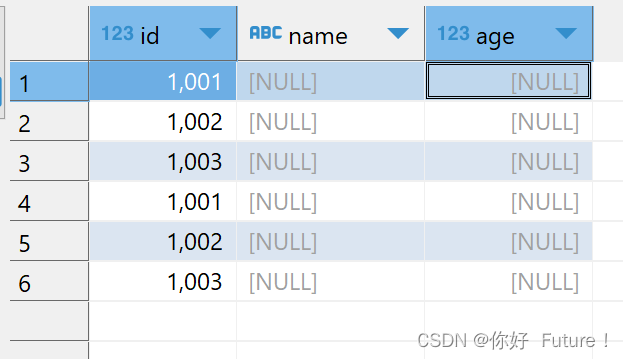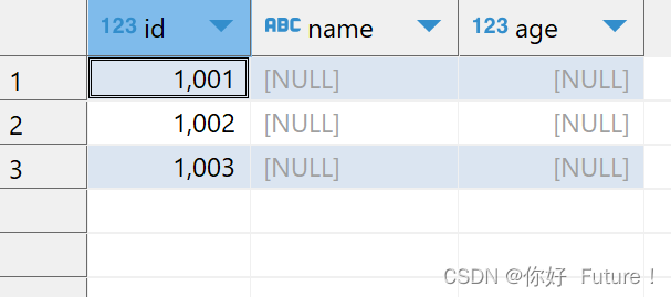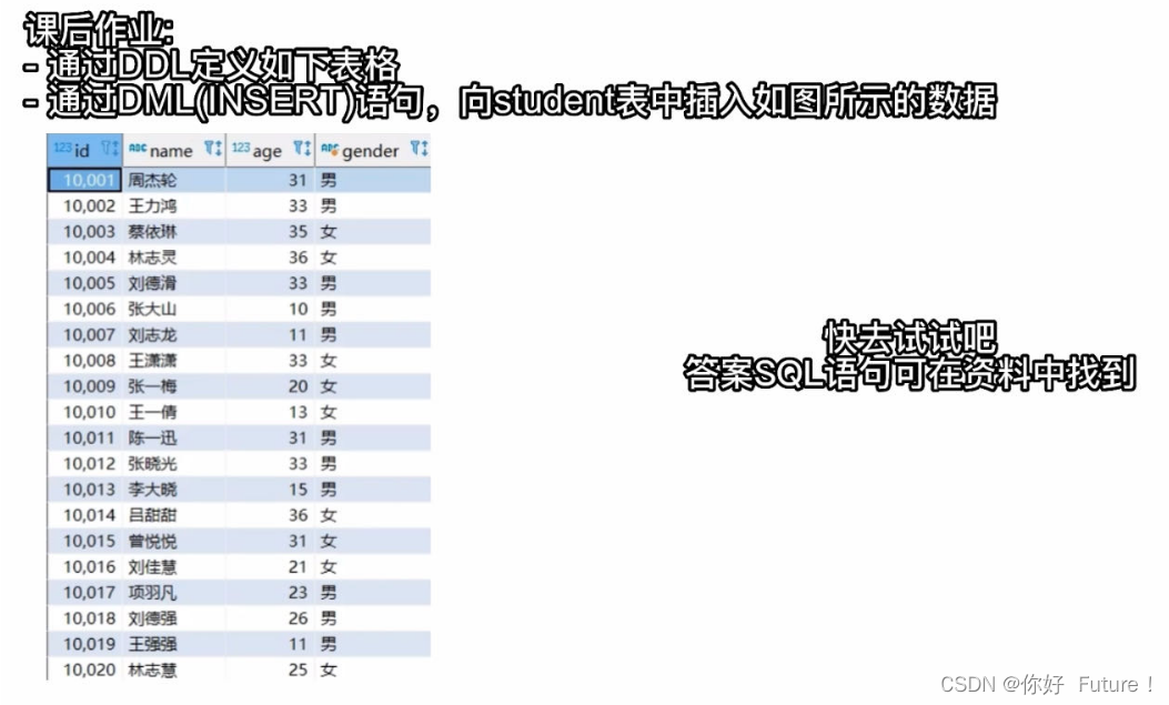(10010, '王一倩', 33, '男'), (100011, '陈一迅', 12, '女'),