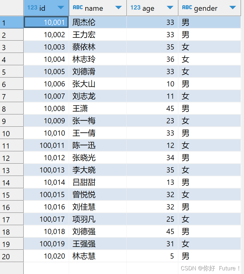 (10002, '王力宏', 33, '男'), (10003, '蔡依林', 35, '女'),