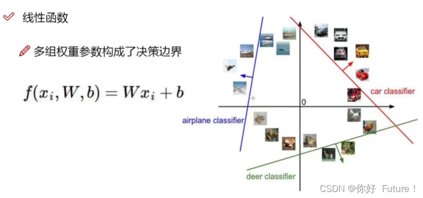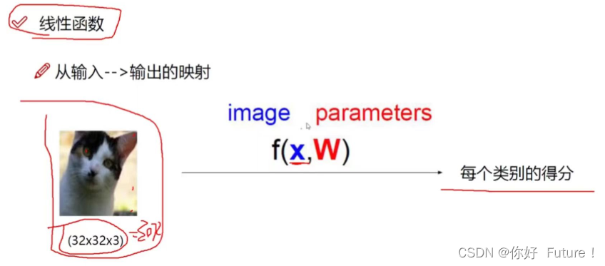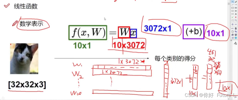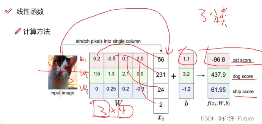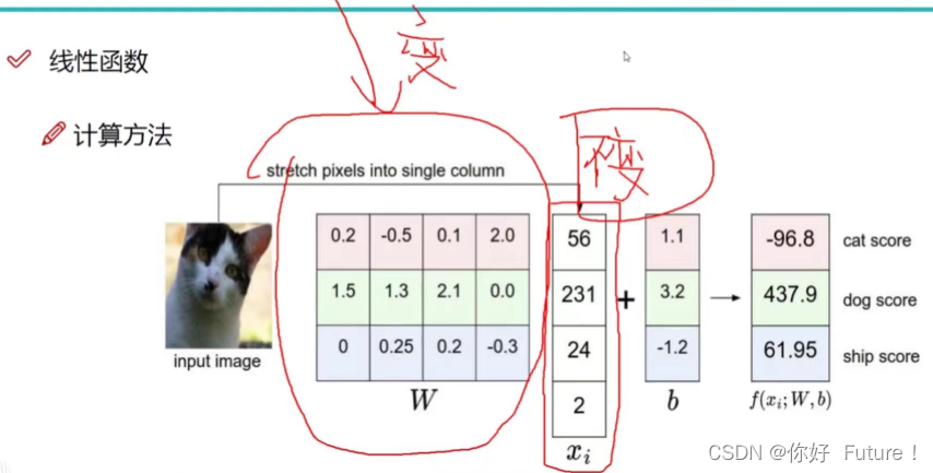 考虑像素点的权重:W是权重参数,x表示输入图像像素值,b是偏置参数(微调)