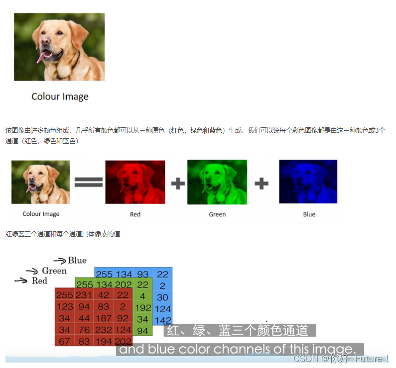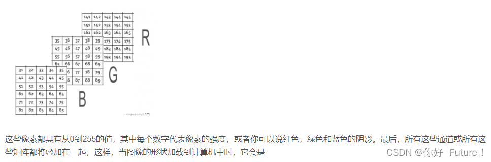 在计算机中一张图片被表示成三维数组的形式,每个像素点的值从0到255,例如:300*100*3【表示:图片高度为300像素(即有300个像素点),宽度为100像素,其中3表示有3个颜色通道,如RGB】