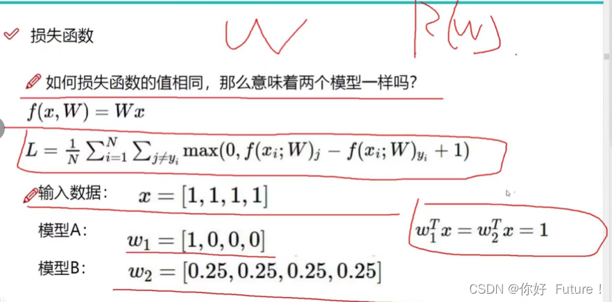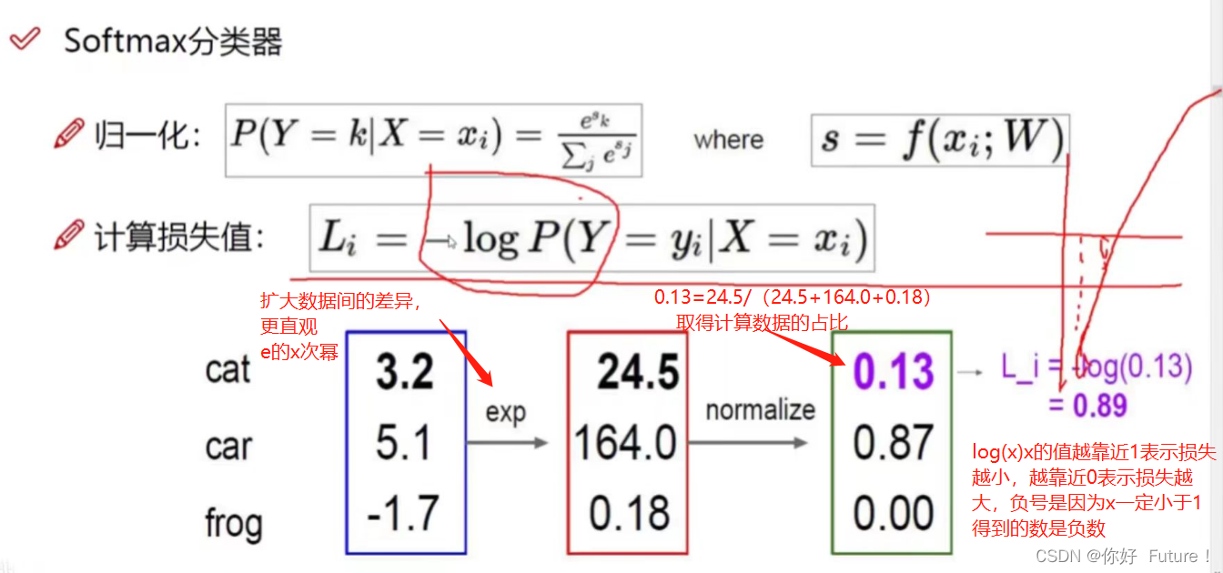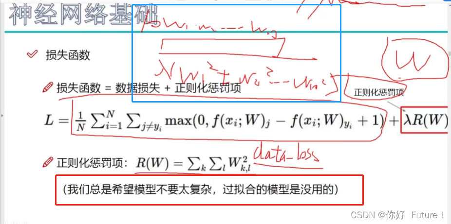 正则化惩罚项:由权重参数所带来的损失,蓝色方框为计算公式,λ表示惩罚系数,系数越大表示我不要那些变异的;系数越小表示变异的数据我也能接受。