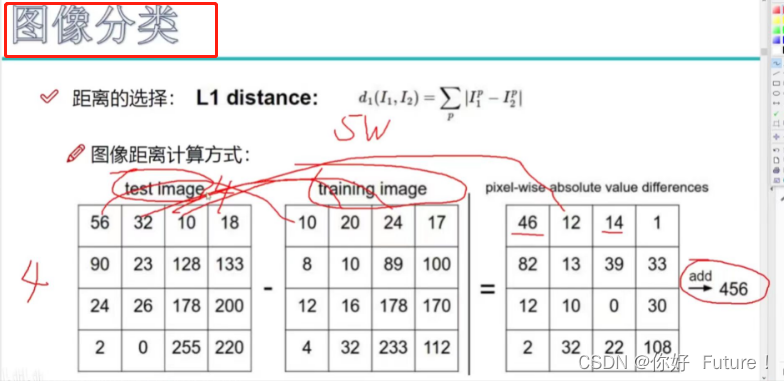 假如我们对图像采用KNN算法进行识别,其中距离计算采用如下方式(test-image像素值减去pixel-wise absolute value differences像素值得到training image像素值)