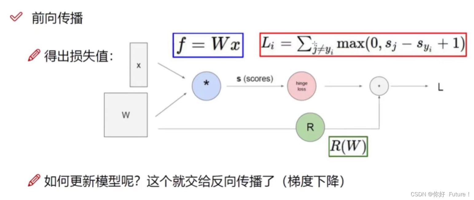 以上计算过程都是前向传播。反向传播是说得到的损失大的W该如何调整呢?(为了能让损失下降,即优化的过程)