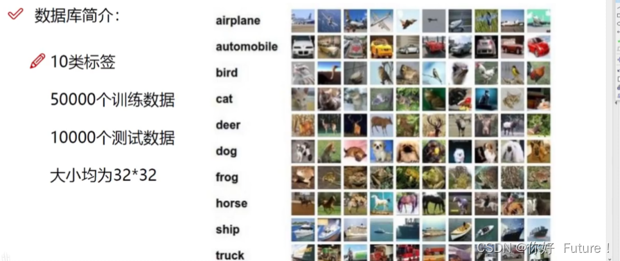 数据库推荐:CIFAR-10,这个数据库并不大,但分类多,数据量多,很适合用来测试。