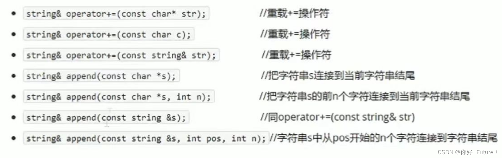 方式一: +=(可追加字符、char*、string类型)