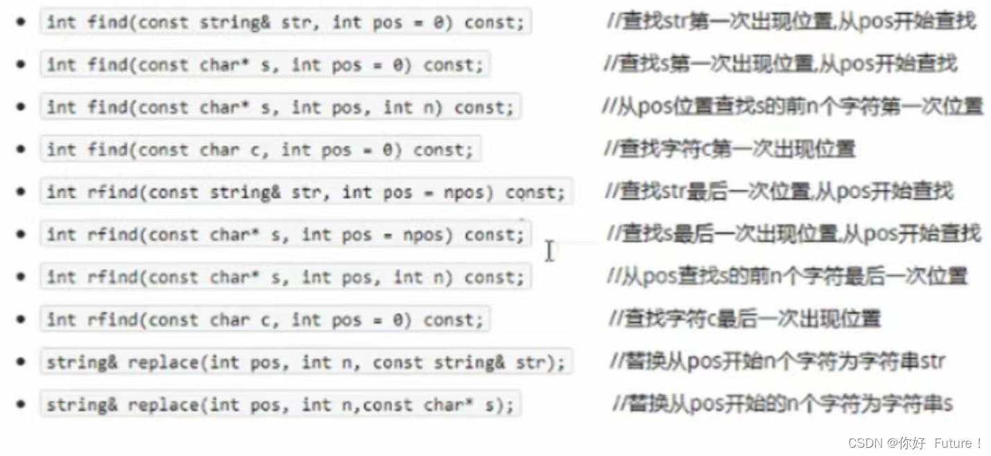 - string类内部封装了很多成员方法,例如:查找find、拷贝copy,删除delete,替换replace,插入insert