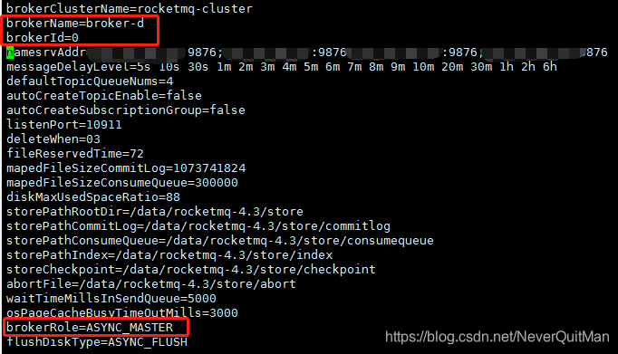 使用vim /data/rocketmq-4.3/conf/4m-4s-async/broker-d.conf命令,修改配置: