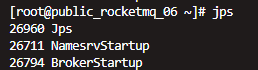 上图可以看出namesrv和broker都已启动成功。当然,这次新加的节点不作namesrv使用,所以我们在使用jps指令时只能看到BrokerStartup,我截上图只是想说明不管是broker和namesrv都可以通过jps来查看。