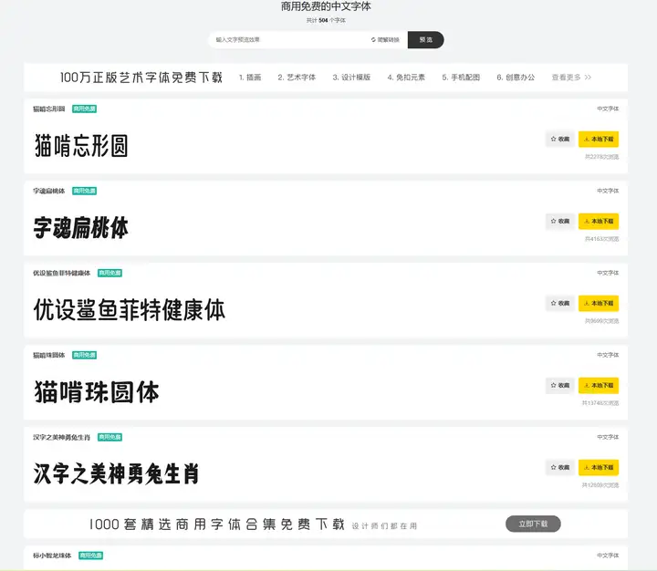 这是一个字体品牌设计师交流网站,收集了很多个人字体,免费商用的中文字体就有差不多500多款,还有很多英文字体可供选择,但网站广告比较多,选择下载时需要注意哦。