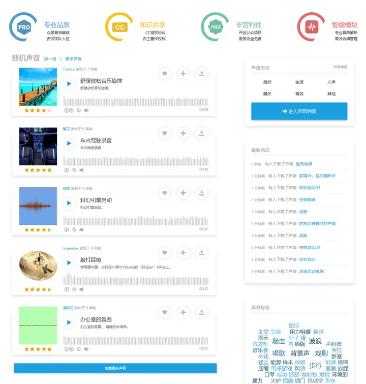 良心网站,非营利性,这里面有非常多的音效、配乐素材,网站入驻了专业的录音师,所有音频素材都是CC授权,全部可以免费下载使用,甚至可用于商业性目的,但在使用时必须明确提及音频的原作者。