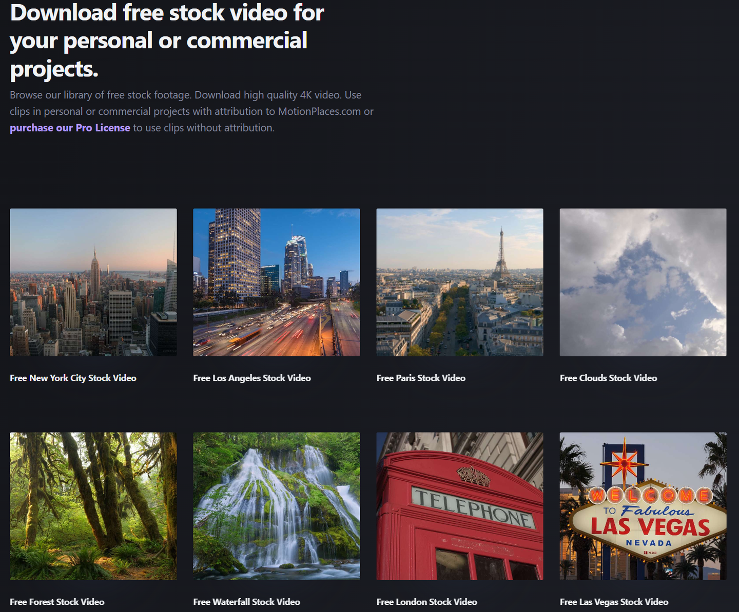 Motion Places 提供了来自全世界各地的免费视频素材。在这里你可以找到各个国家的城市风光视频,用于任何目的。网站可以免费下载高清质量剪辑素材,或以 99 美元的价格购买 4K 剪辑素材。