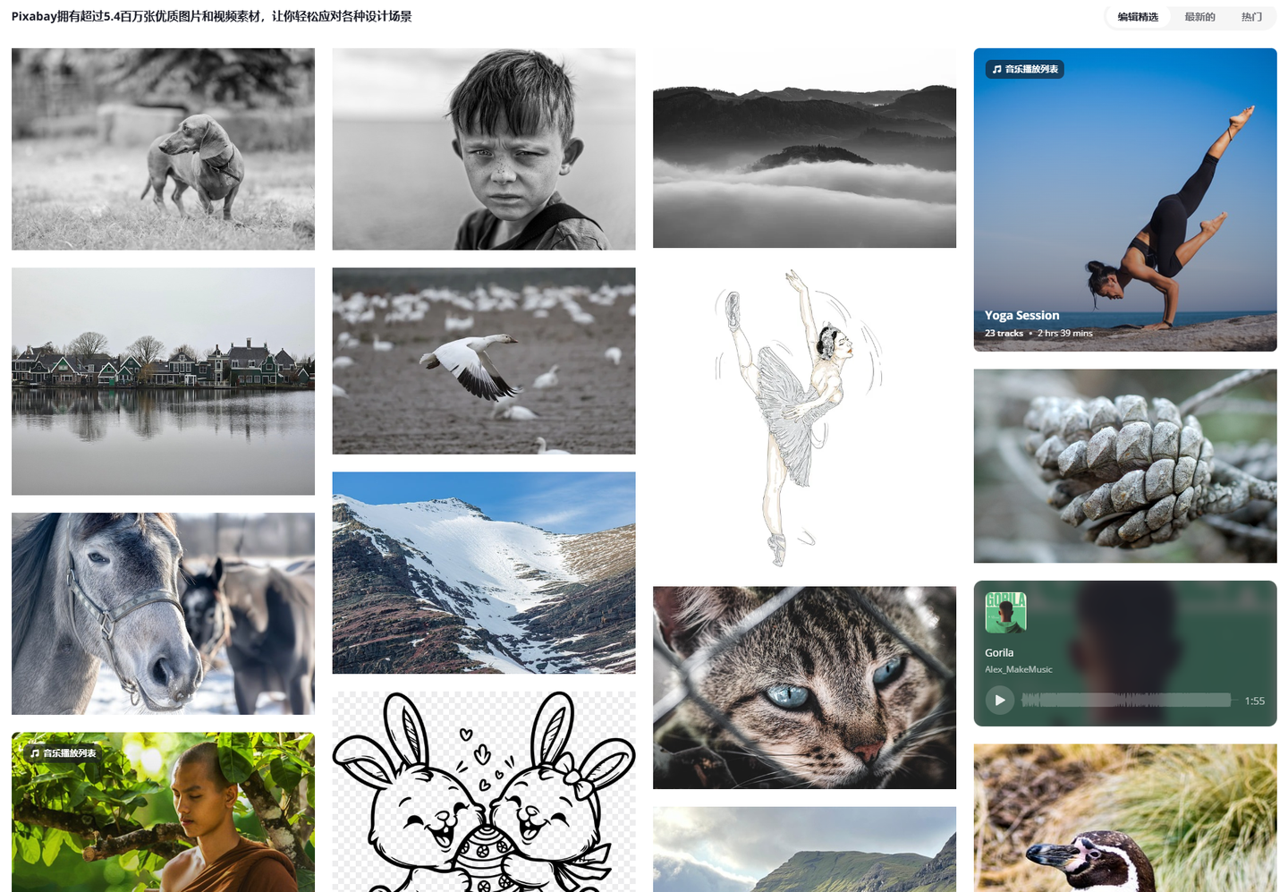 Pixabay 共有约 600000 张免费的图片、插画以及矢量图,无需注册就能免费下载,还可以商用。Pixabay 为每一位作者都提供了个人主页,使用者可以关注、点赞以及给作者打钱买咖啡。除此之外还提供了免费的视频素材供用户随意使用。