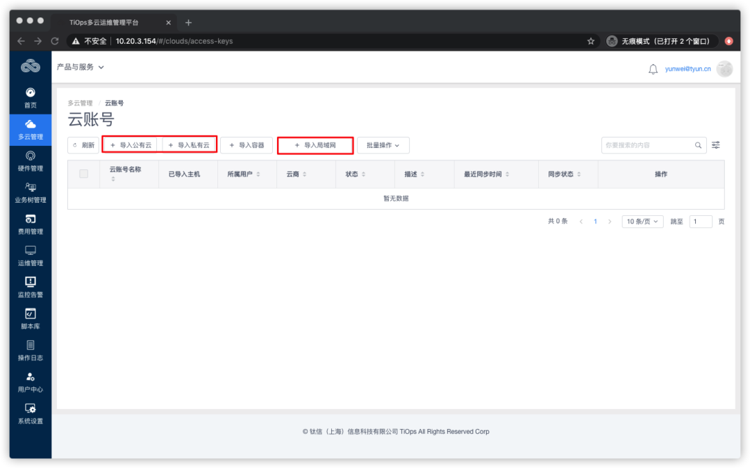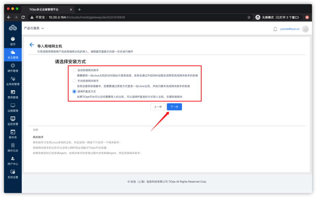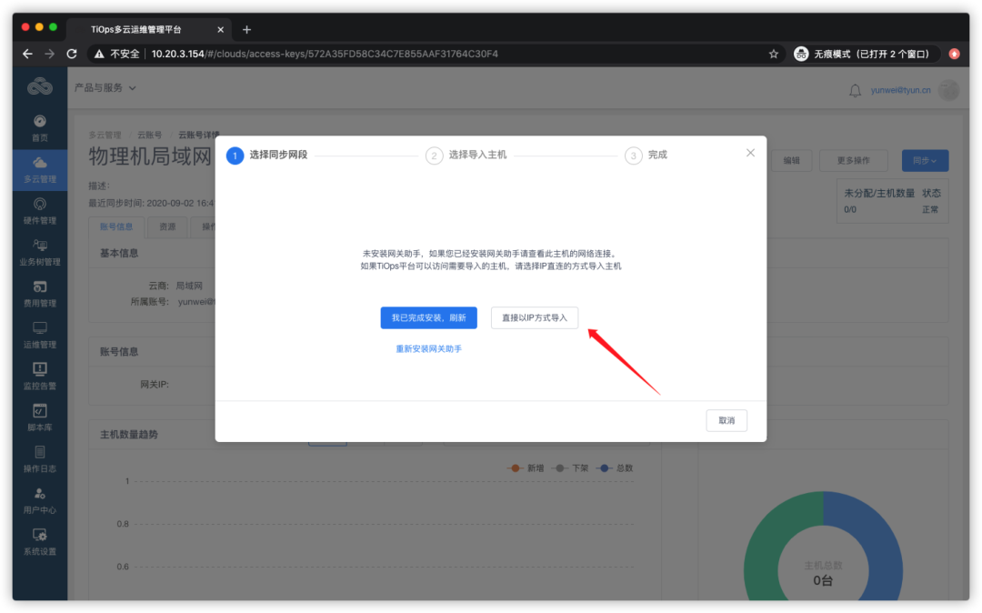 局域网支持两种模式,一种是直连,简单的理解就是被管理的主机与TiOps平台可以直接连通;二是通过网关助手,这种情况下被管理的主机和TiOps平台不通,需要通过网关助手作为代理才能连通。本次测试选择使用IP直连方式,点击【下一步】,完成云账号创建,下面开始导入资源: