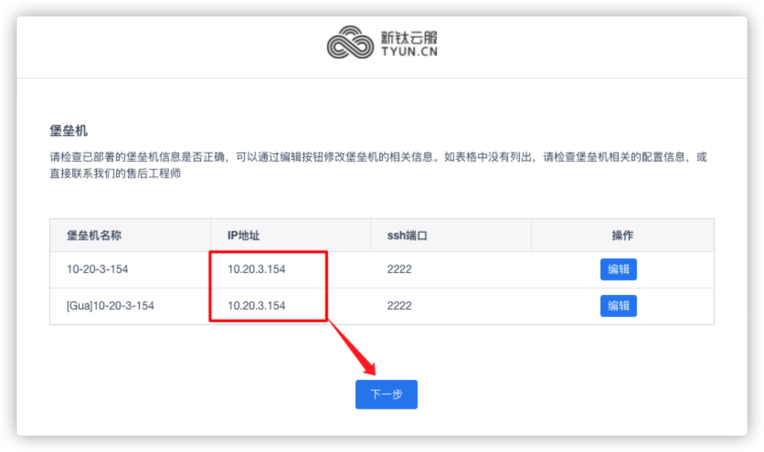 展示堡垒机信息,重点看IP地址,如果你安装的主机有多个IP地址,这里显示的不是你希望监听的IP,可以点击编辑进行修改,一般情况下不需要修改,直接点击【下一步】: