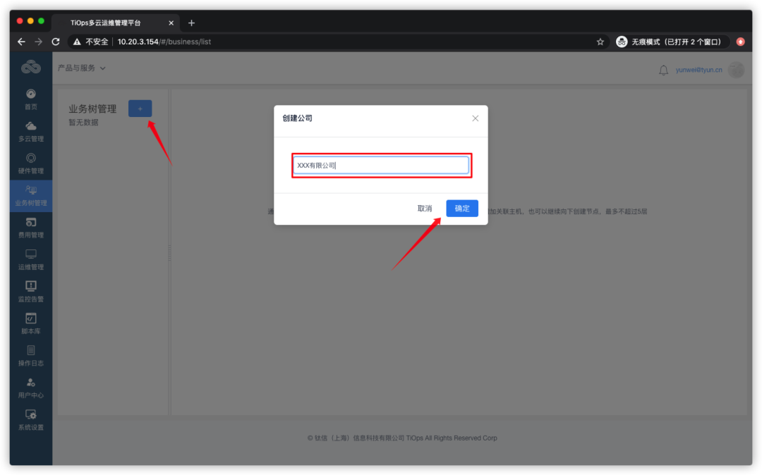 左侧菜单栏【业务树管理】,点击 + 号,创建公司,点击确定: