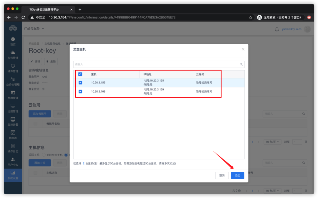 点击【添加主机】,选择已经绑定到业务树的主机,并点击【添加】完成绑定,注意,已经绑定本凭证,或者未分配到业务树的主机不能绑定凭证。