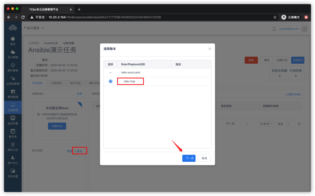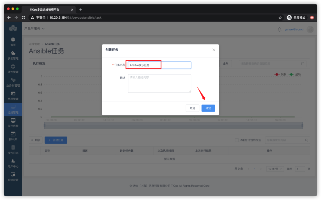 在左侧菜单栏,点击【运维管理】--【Ansible】--【Ansible任务】: