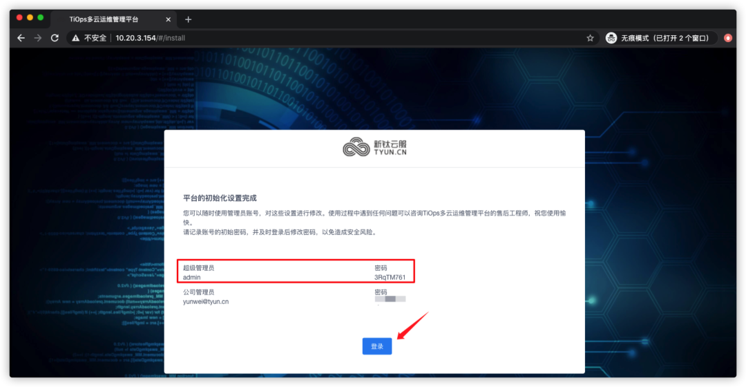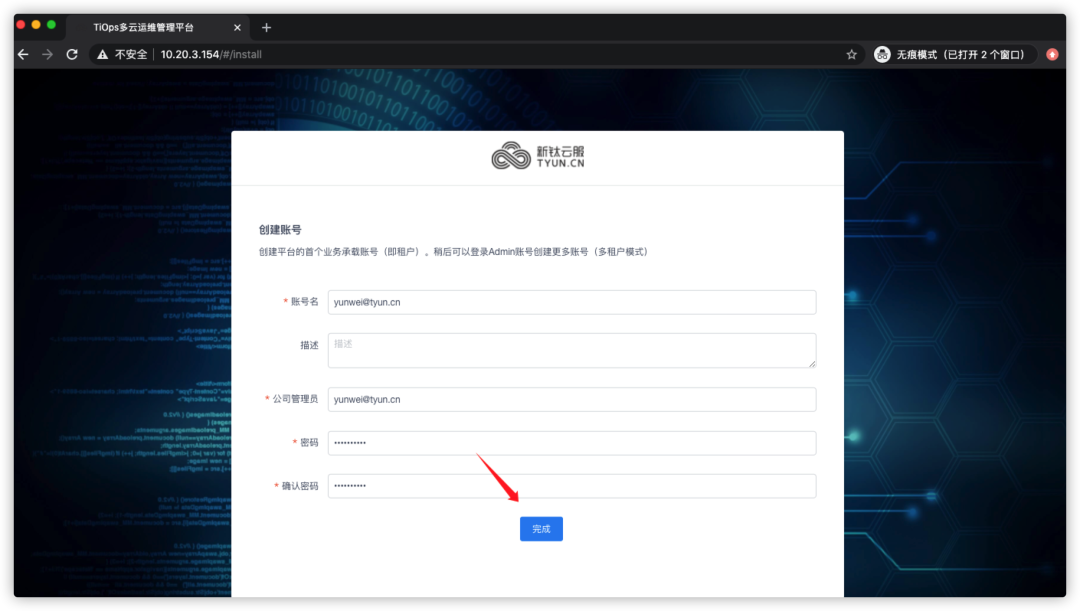 创建租户管理员账号和密码,然后点击【完成】: