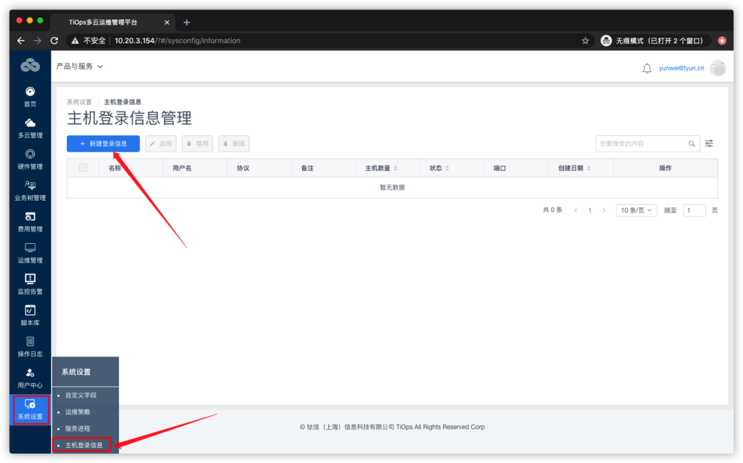 点击左侧菜单栏【系统设置】-- 【主机登录信息】: