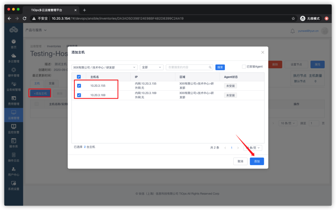 在详情页中,点击【添加主机】,可以通过业务树、模糊搜索、精确搜索等方式,找到主机,选择主机,点击【添加】: