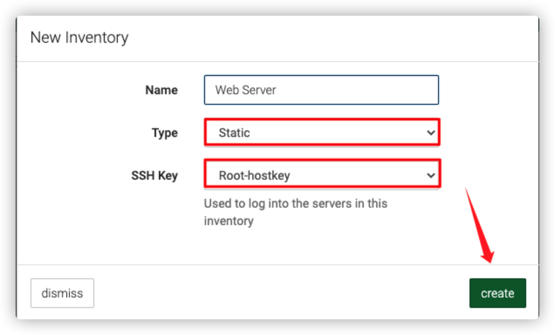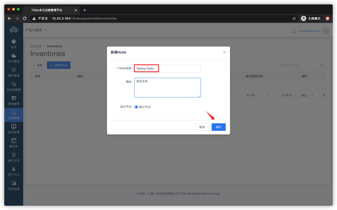 在点击左侧菜单栏【运维管理】--【Ansible】-- 【Inventories】,选择创建Hosts: