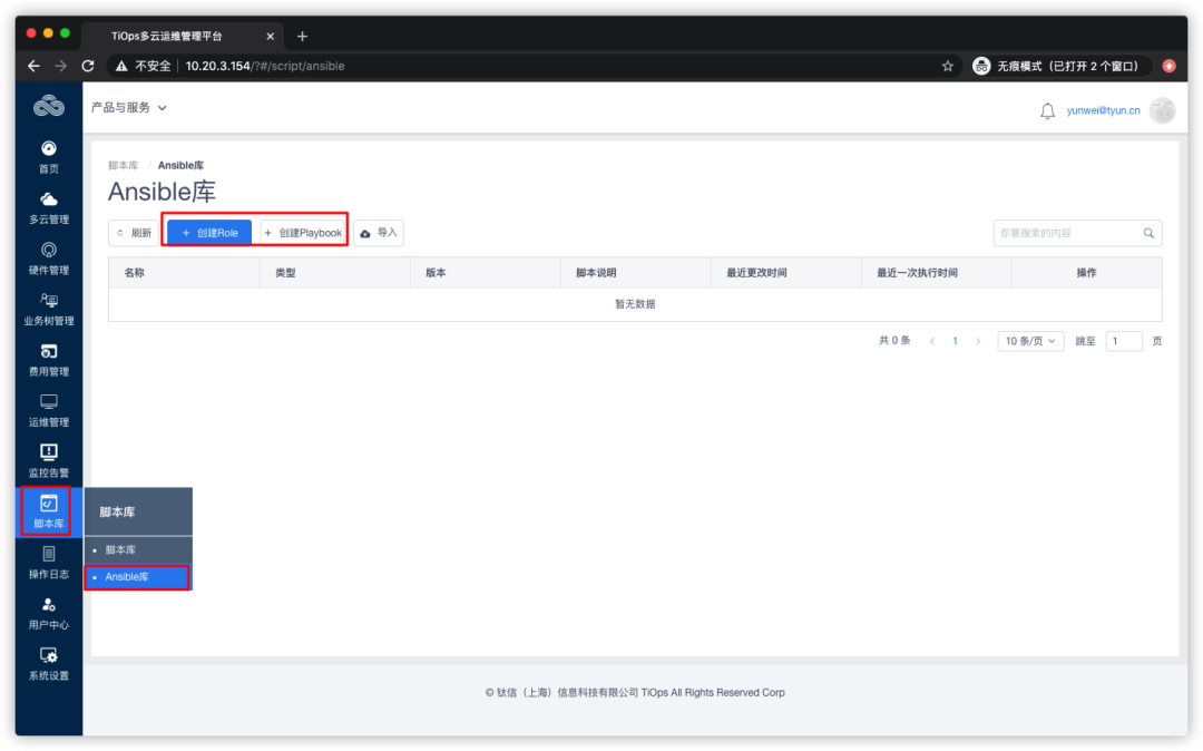 点击左侧菜单栏【脚本库】--【Ansible库】,支持创建Role和创建Playbook,同时还支持直接导入: