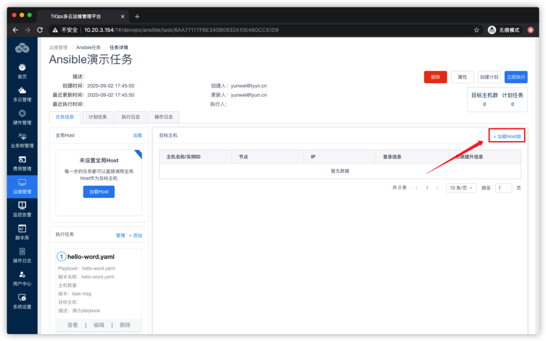 任务添加完成之后,还需要【加载Hosts】,也就是需要执行,这个Playbook在哪些机器上执行,和之前定义的Inventory进行关联: