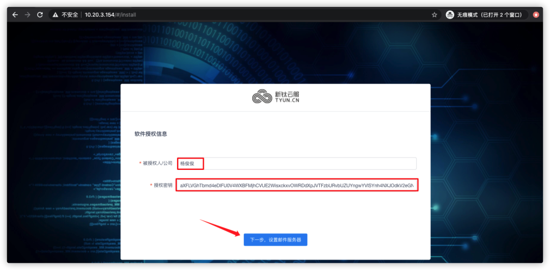 根据安装结束时的提示,访问http://ip ,开始TiOps初始化,被授予人/公司,可以写公司名或者个人姓名都可以,授权密钥,如果是通过官网下载的话,下载地址和密钥都在邮件里面: