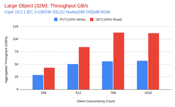 采用 32 MiB 对象(EC 2+2 配置,启用 RGW SSL,12 节点,1024 客户端线程)实现了 111 GiB/s 的总 GET 吞吐量。