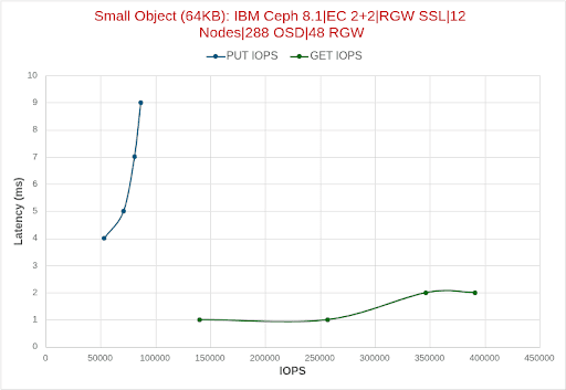 ~86.6K PUT IOPS 使用相同的配置(64KiB、EC 2+2、带 SSL 的 RGW、12 个节点、1024 个客户端线程)记录。PUT 吞吐量峰值为 ~5.4 GiB/s,完全并发(1024 个客户端线程)时的平均延迟为 ~8 毫秒。