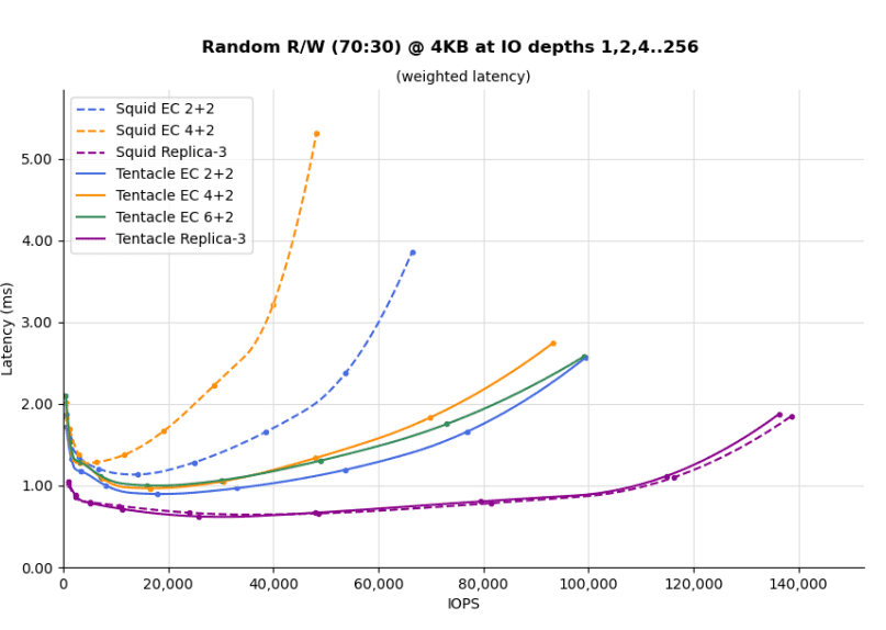 不同纠删码配置(2+2、4+2、8+3)下的延迟表现保持稳定,进一步表明测试期间的瓶颈在于网络而非计算资源。