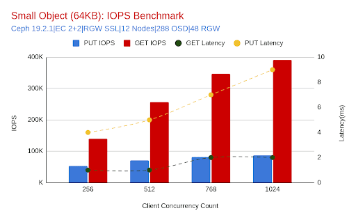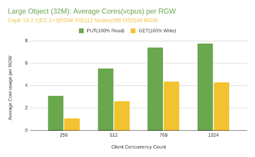 限制因素:RGW 上的 CPU 使用率开始上升(768 个 vCPU 的 ~9.8%),但系统仍有空间。跨客户端线程的低延迟和一致的扩展表明,集群可以通过额外的客户端资源/并发来推送更高的 IOPS。