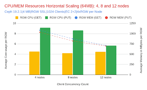 对于小型对象应用 (64 KB),RGW CPU 使用率显示出 GET 和 PUT 作之间的明显区别。GET 操作类型应用的每个 RGW 守护进程消耗的 CPU 要多得多,从低并发时的 ~3 个内核扩展到每个 RGW 的近 10 个核心,有 8 个客户端(1,024 个线程)。相比之下,PUT 工作负载始终保持较轻,即使在最大并发性下,每个 RGW 的峰值也略低于三个核心。