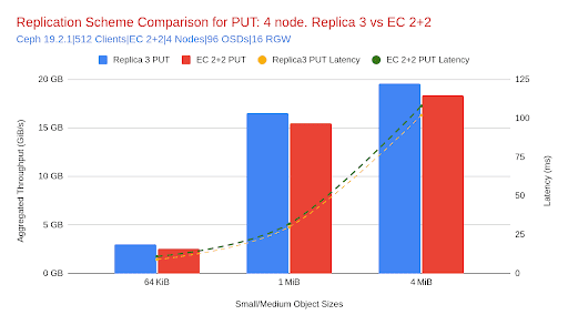 对于小对象(64 KiB),副本数 3 配置显著优于 EC 2+2:PUT 吞吐量高出 18%,GET 吞吐量高出 37%。该现象符合预期:纠删码的编解码开销会增加延迟与计算成本,使副本数 3 更适用于高操作频率的小对象工作负载。