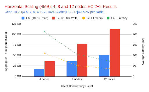 可预测的线性扩展:随着集群从 4 个节点扩展到 12 个节点,GET 吞吐量几乎增加了两倍,从 ~39 GiB/s 增长到 ~113 GiB/s。PUT 吞吐量同样增加了 3× 以上,从 ~15.5 GiB/s 上升到略高于 50 GiB/s。这种线性增益印证了 Ceph 对象网关在读写操作上水平扩展能力的有效性。