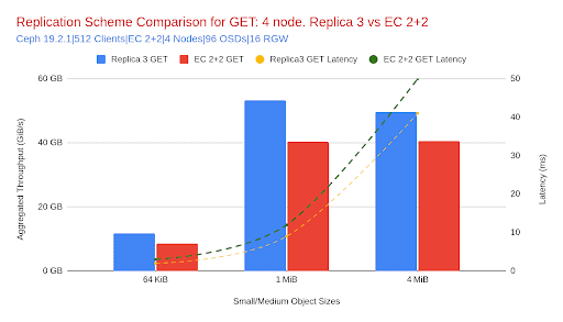 为深入比较复制与纠删码在不同对象下的性能表现,我们在四节点集群上分别采用副本数 3(replica 3)与 EC 2+2 配置对 Ceph RGW 进行测试(网关层启用 SSL)。虽然理想情况下应在十二节点集群进行对比,但由于时间限制,副本数 3 配置仅于四节点环境完成测试。我们计划在支持快速纠删码优化的 Tentacle 功能可用后,使用更大规模部署重新进行基准测试。