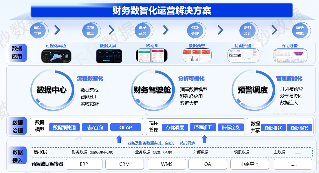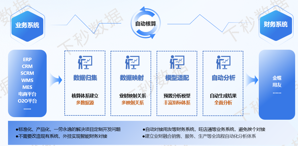 下秒数据财务解决方案是为市面像金蝶、用友等主流ERP、行业量身打造,可在短时间内更灵活地为不同企业搭建起更适用企业级财务自动分析系统的标准化、通用型解决方案。